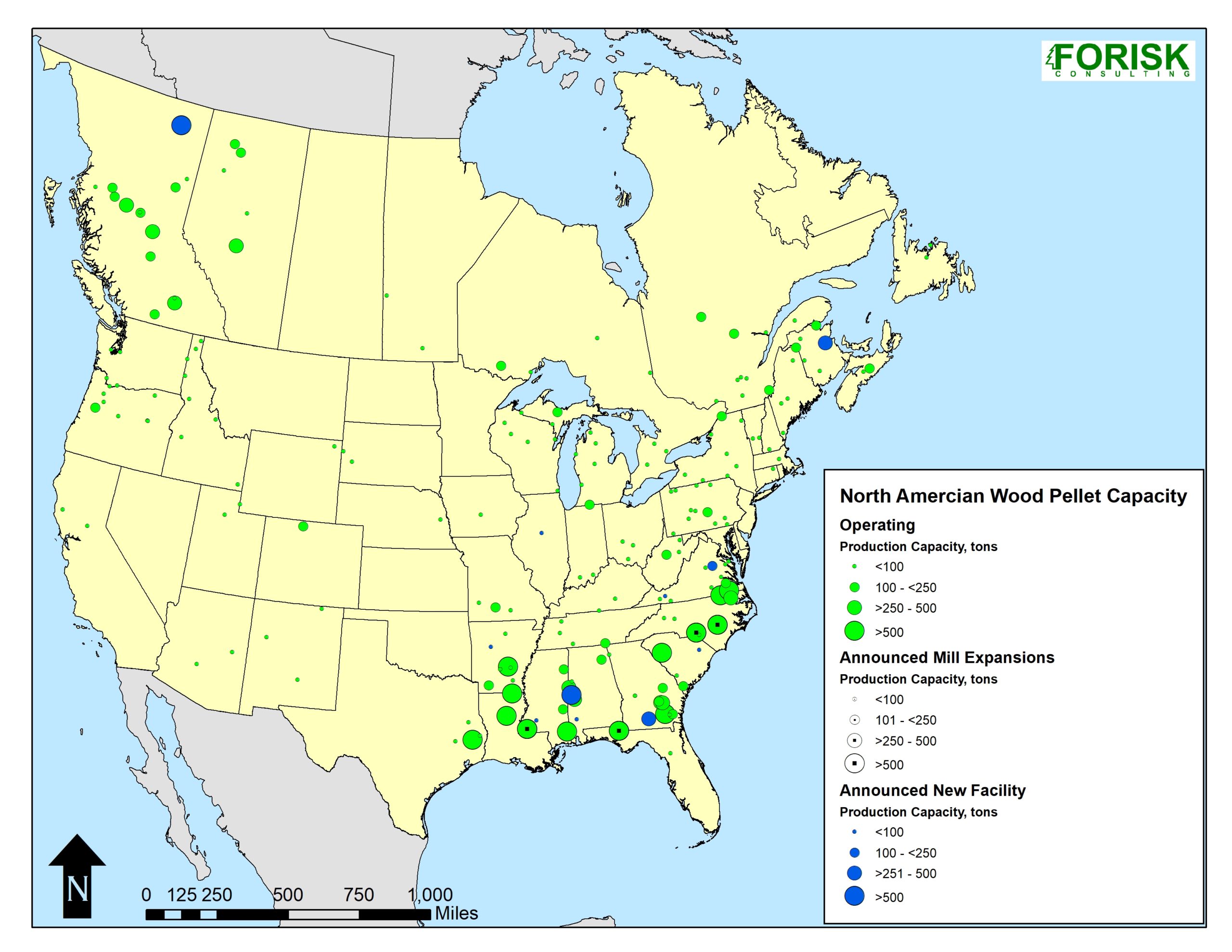 The Forisk Research Quarterly publishes analysis of the wood pellet sector in North America and capital investment trends. To produce custom reports and maps, check out Forisk’s North American Forest Industry Capacity Database. Discounted rates available for companies that also subscribe to the Forisk Research Quarterly (FRQ). The Forisk Market Bulletin (FMB) provides market intelligence and tracking for U.S. and Canadian forest industry capital investments and timberland transactions. Email bmendell@forisk.com or call 770.725.8447 for pricing information and to place an order.