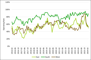 U.S. wood pellet production facilities can be classified into two categories: “industrial grade,” which is mostly produced in the South and “domestic use grade,” which is primarily produced in the East and West. In addition to different end uses, the two categories of pellet producers operate differently. For industrial grade pellets, a vast majority are pre-sold under long term take-or-pay contracts, while domestic producers operate more at the mercy of the prevailing market prices, so operating rates tend to fluctuate more in the East and West. When domestic grade pellet prices are high, operating rates increase. When they are low, domestic grade producers pull back production by running facilities at operating rates lower than their full capacity. This reflects how domestic grade producers operate more directly in competitive spot market conditions, so are “price-takers”.